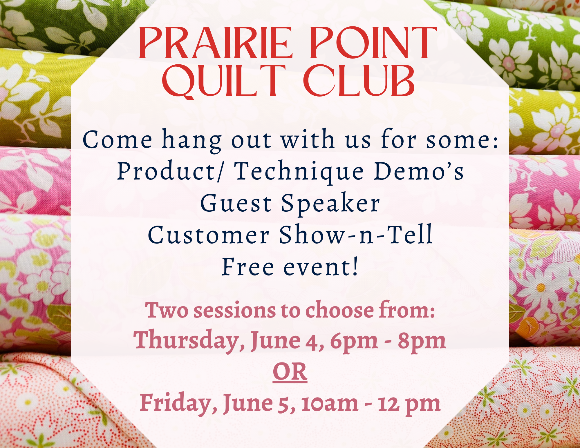 At Prairie Point Quilt & Fabric Shop, it is our mission to provide you with fabrics, notions, patterns, books, and inspiration...everything you need for sewing projects including quilts, bags, clothing, and home decor. We are more than a quilt shop. We are now a creative sewing center.
