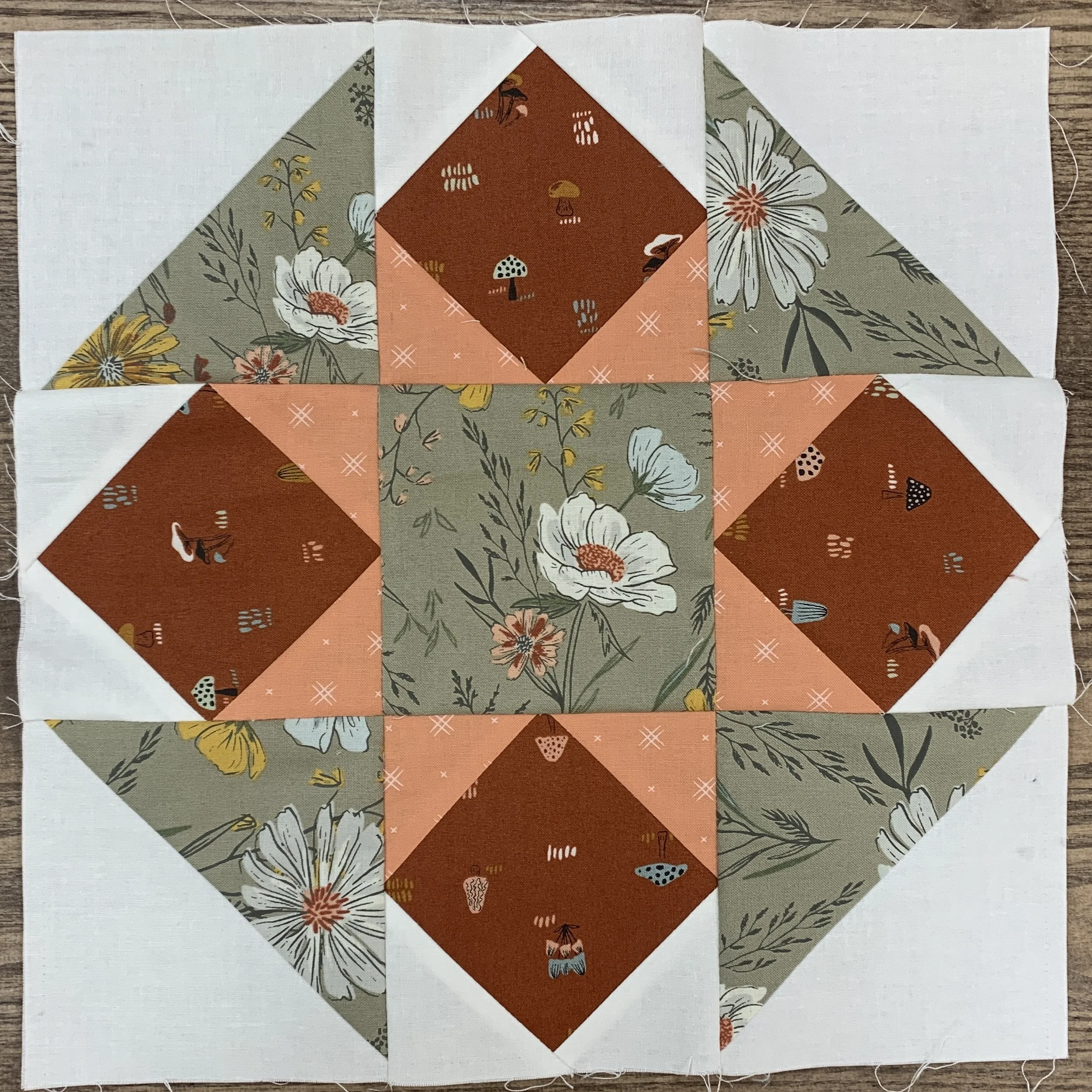 September — Our first block of the season is simple but stunning. One of my favorites. We’re beginning with four prints in addition to the background; it won’t usually be this way. The half square triangles here looks like the LeMoyne Star block. You don’t have to follow the ABCD order but it’s helpful to start out with instructions that way. Measure twice, cut once!