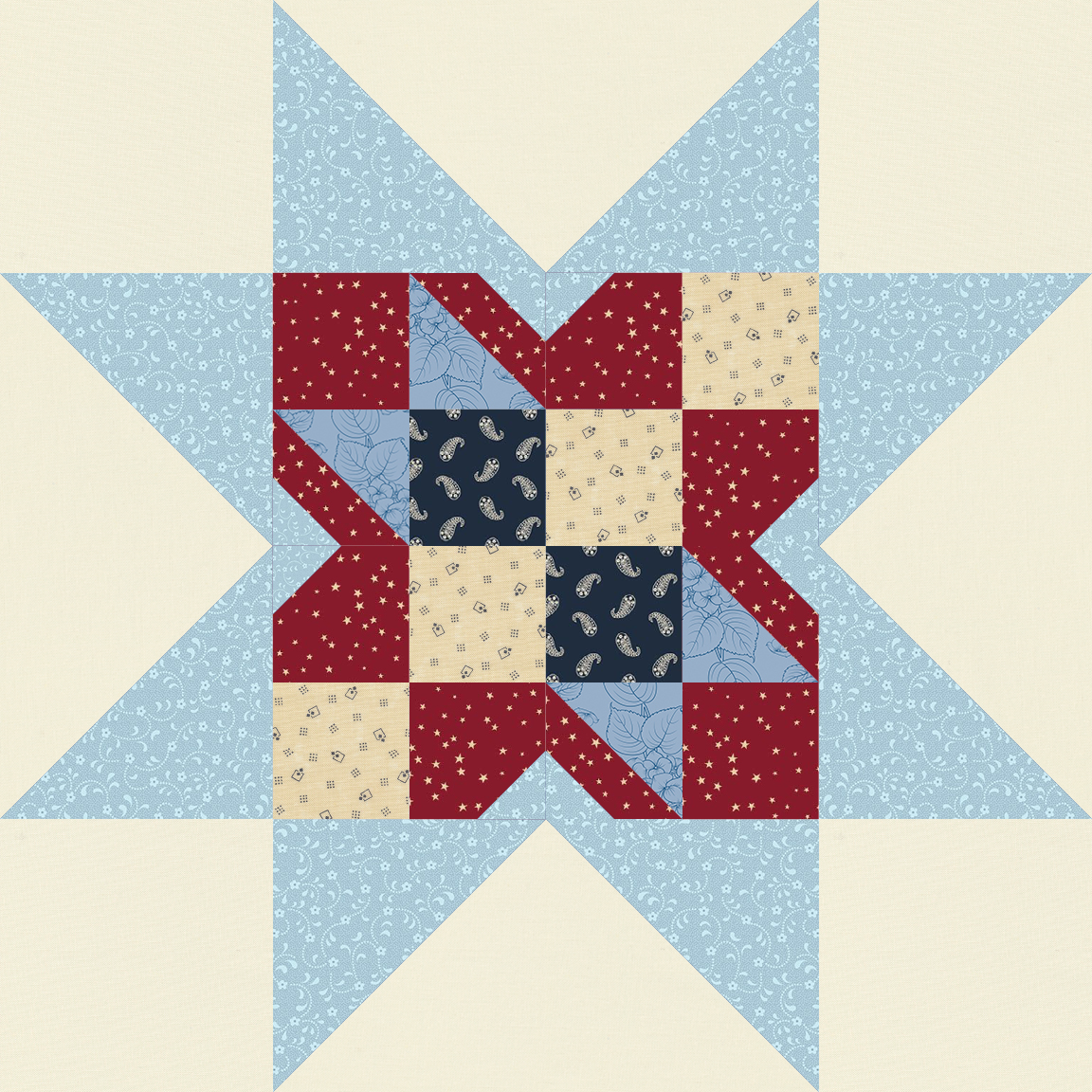 2026 is the year to celebrate the Semiquincentennial – the 250th anniversary of the Declaration of Independence. The collection of fabrics in this block-of-the-month will represent a time closer to the original founding of our country with fabrics from Pam Buda, Jo Morton, and several other of our favorite reproduction designers. Imagine yourself watching a fireworks display while relaxing on this perfect Americana quilt.