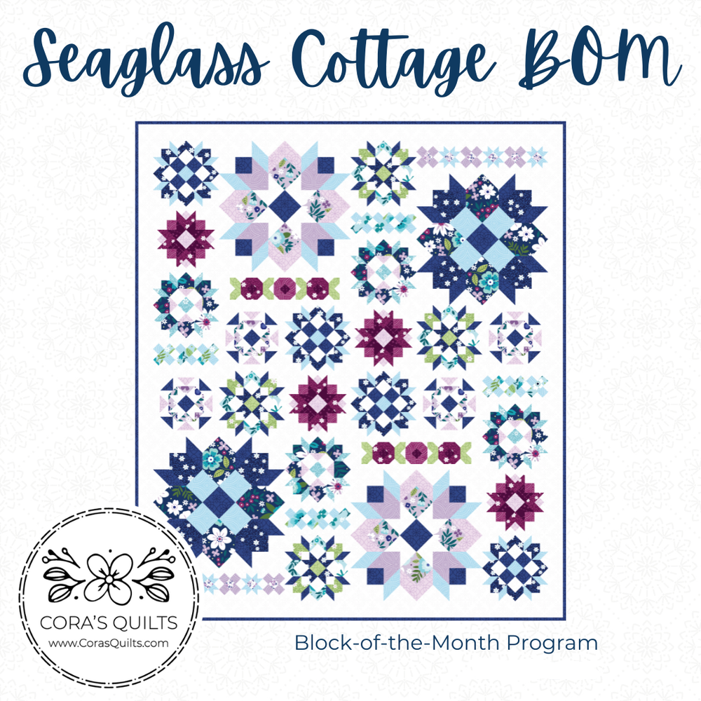 The SEAGLASS COTTAGE quilt by Shelley Cavanna of Cora’s Quilts is a beautiful sampler quilt showcasing her Seaside Garden collection from Benartex. The color palette of cool blue, green, and purple florals is sure to make you feel relaxed and inspired while you sew. The quilt finishes at 80” x 92”.